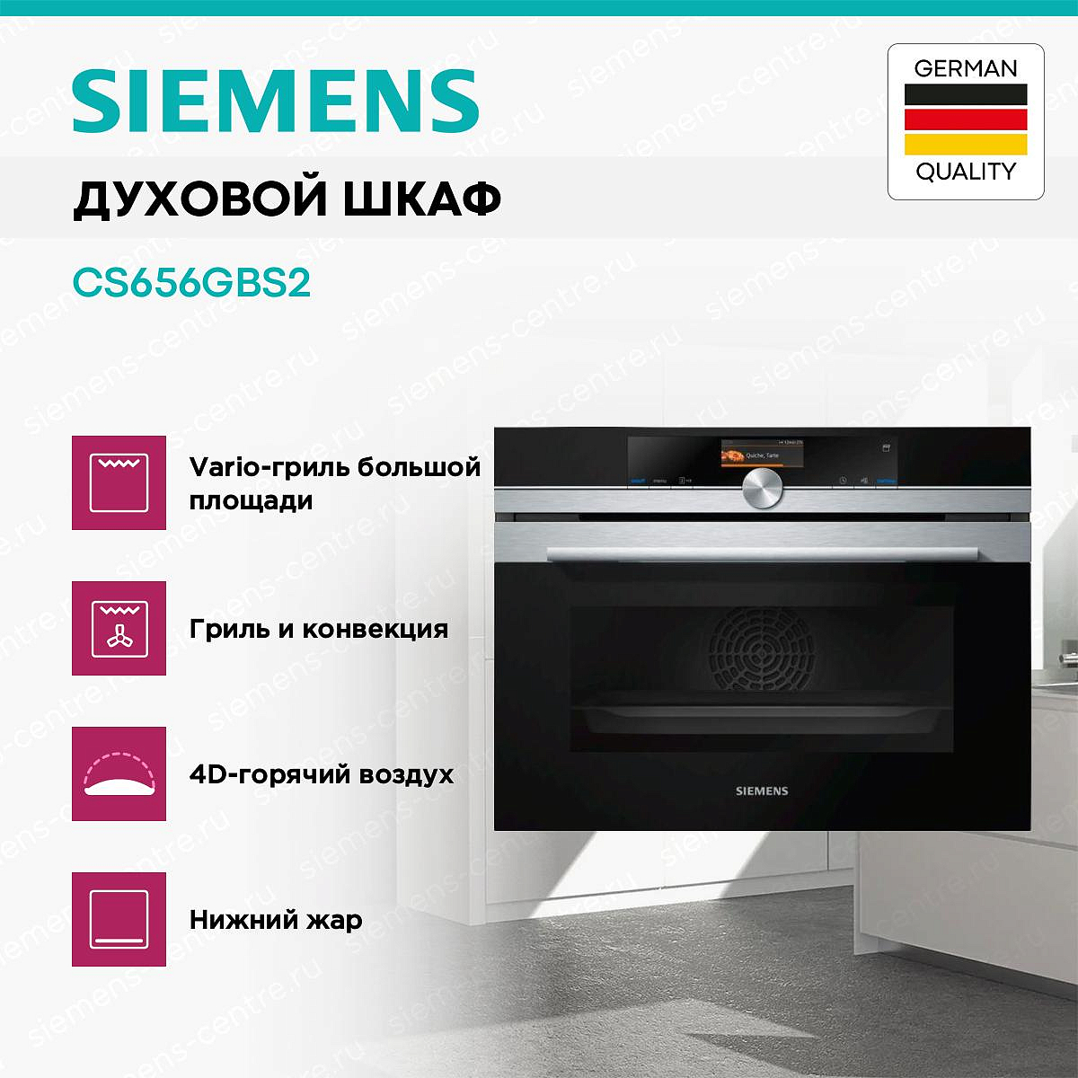 Духовой шкаф Siemens CS656GBS2 — дизайн и функциональность. Режим 4D-горячий воздух равномерно распределяет тепло по внутреннему пространству, что позволяет запекать на четырех уровнях одновременно, при этом запахи не будут смешиваться. Данная опция помогает сэкономить время и электроэнергию. Модель имеет полностью стеклянную внутренняя поверхность дверцы. Функция coolStart позволяет начать приготовление продуктов глубокой заморозки без предварительного разогрева.