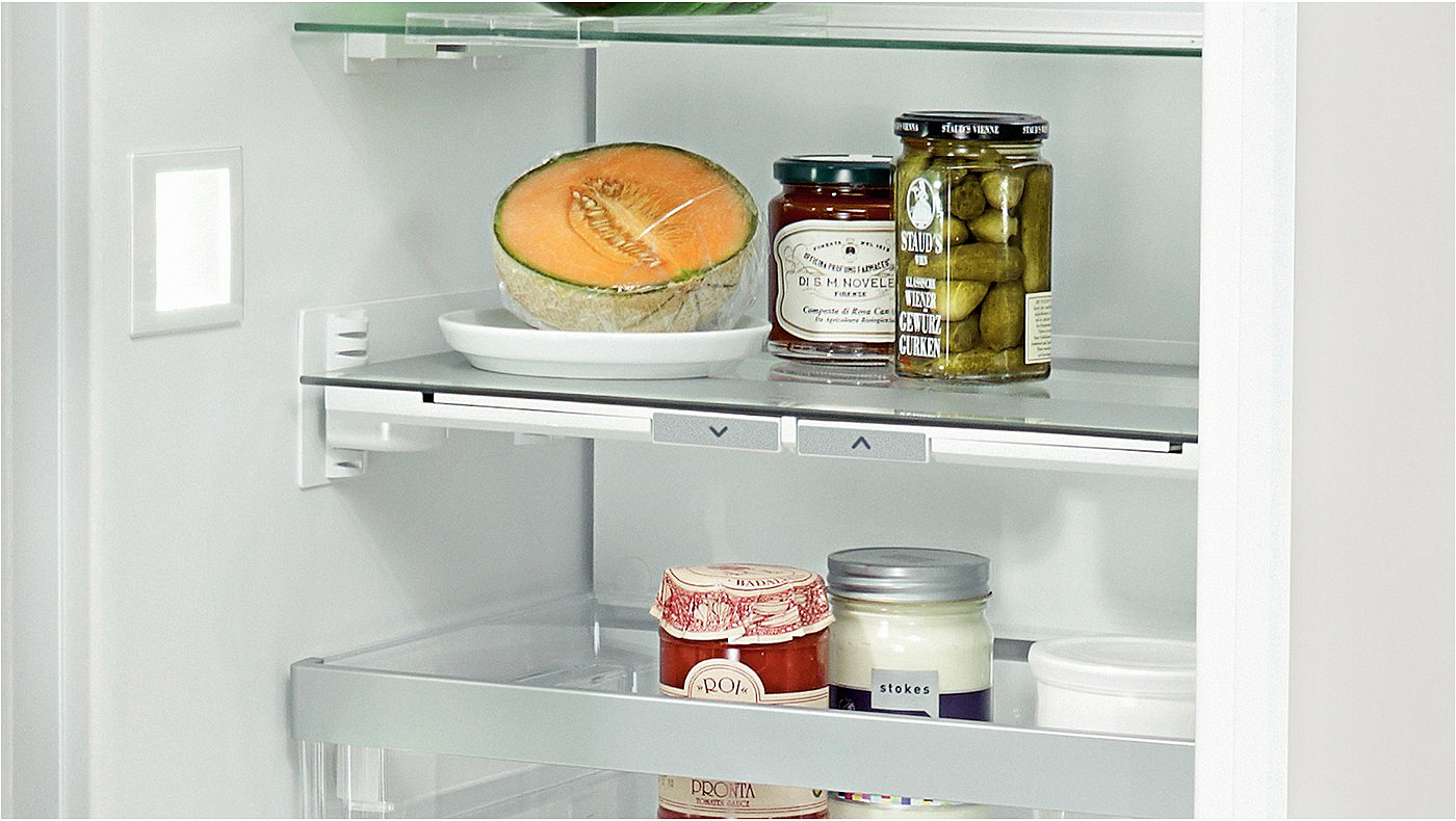 Конструкция данной модели предусматривает электронную раздельную регулировку температуры в холодильном и морозильном отделениях с точностью до 1 градуса. Режимы суперзамораживания и суперохлаждения исключают вероятность повышения температуры в указанных отделениях при одновременной загрузке большого количества продуктов. Полки и дверные контейнеры easyLift легко и быстро перемещаются по высоте, что позволяет рационально использовать внутреннее пространство холодильника.