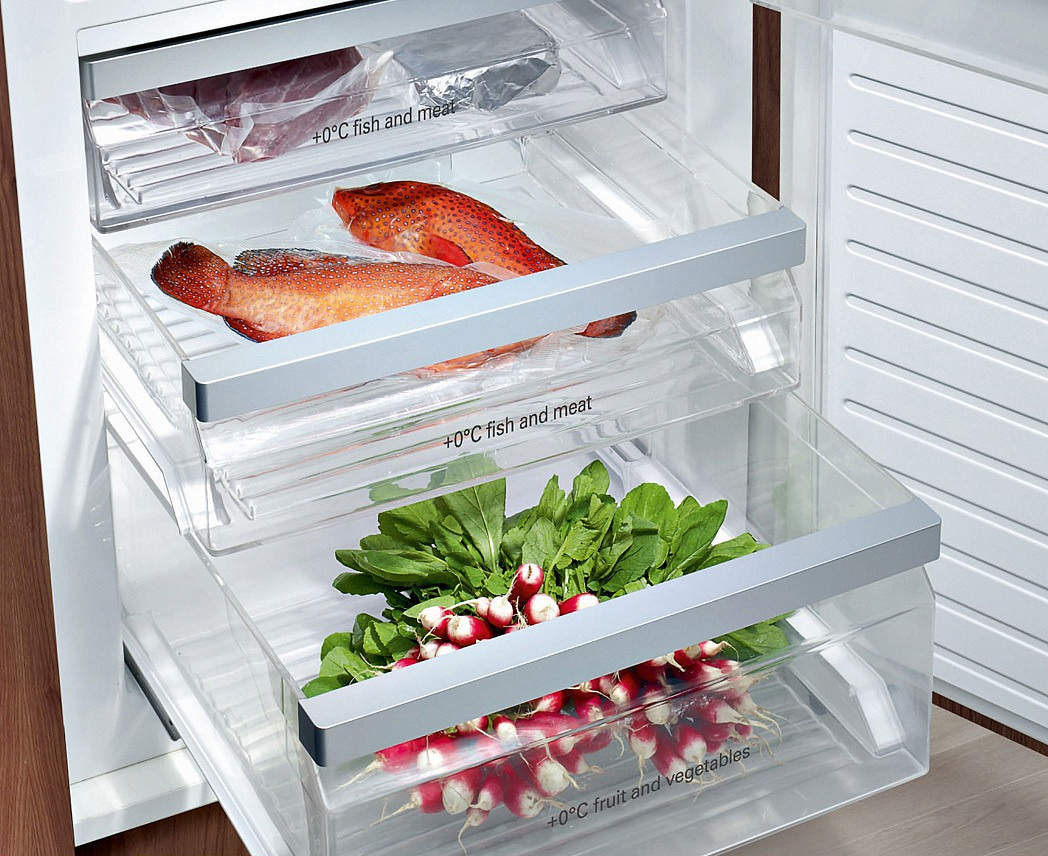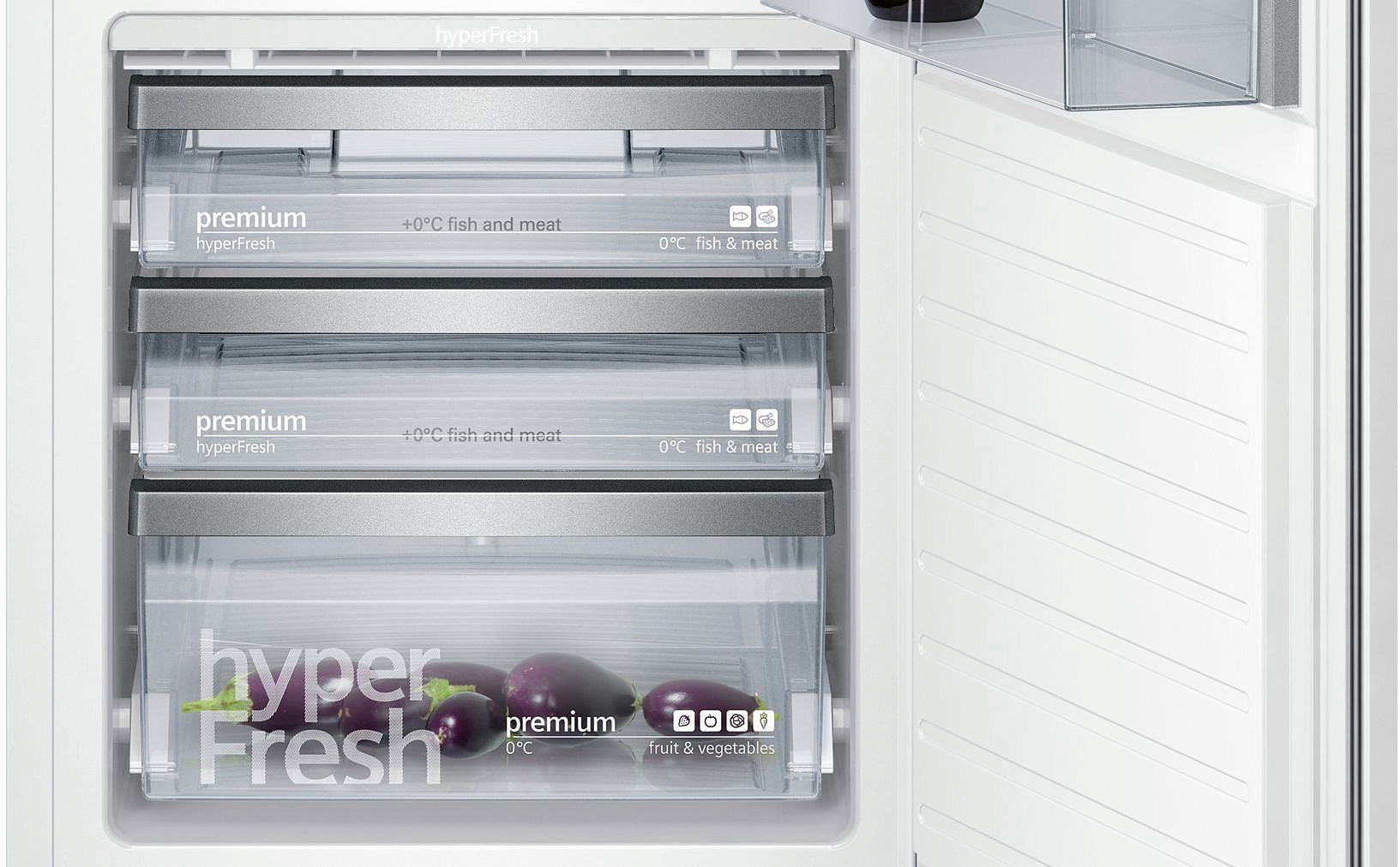 Функциональный и стильный холодильник сочетает высокую производительность и экономичность. Данная модель оснащена отделением hyperFresh premium с тремя отделениями — 1 для овощей и фруктов и 2 для мяса и рыбы, в которых постоянно поддерживается уровень влажности 90% и 50% соответственно, что позволяет сохранить свежесть и полезные свойства продуктов в три раза дольше, по сравнению с обычными контейнерами.