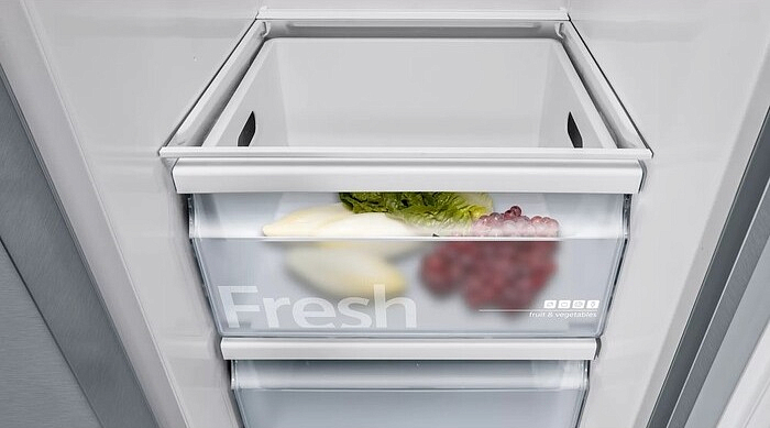 В данной модели предусмотрены зоны свежести с функцией hyperFresh plus, которые позволяют регулировать температуру и влажность для хранения мяса, рыбы, овощей и фруктов. Антибактериальный угольный фильтр airFreshFilter обеспечивает свежий воздух внутри, улавливая микрочастицы веществ, вызывающих неприятные запахи.
