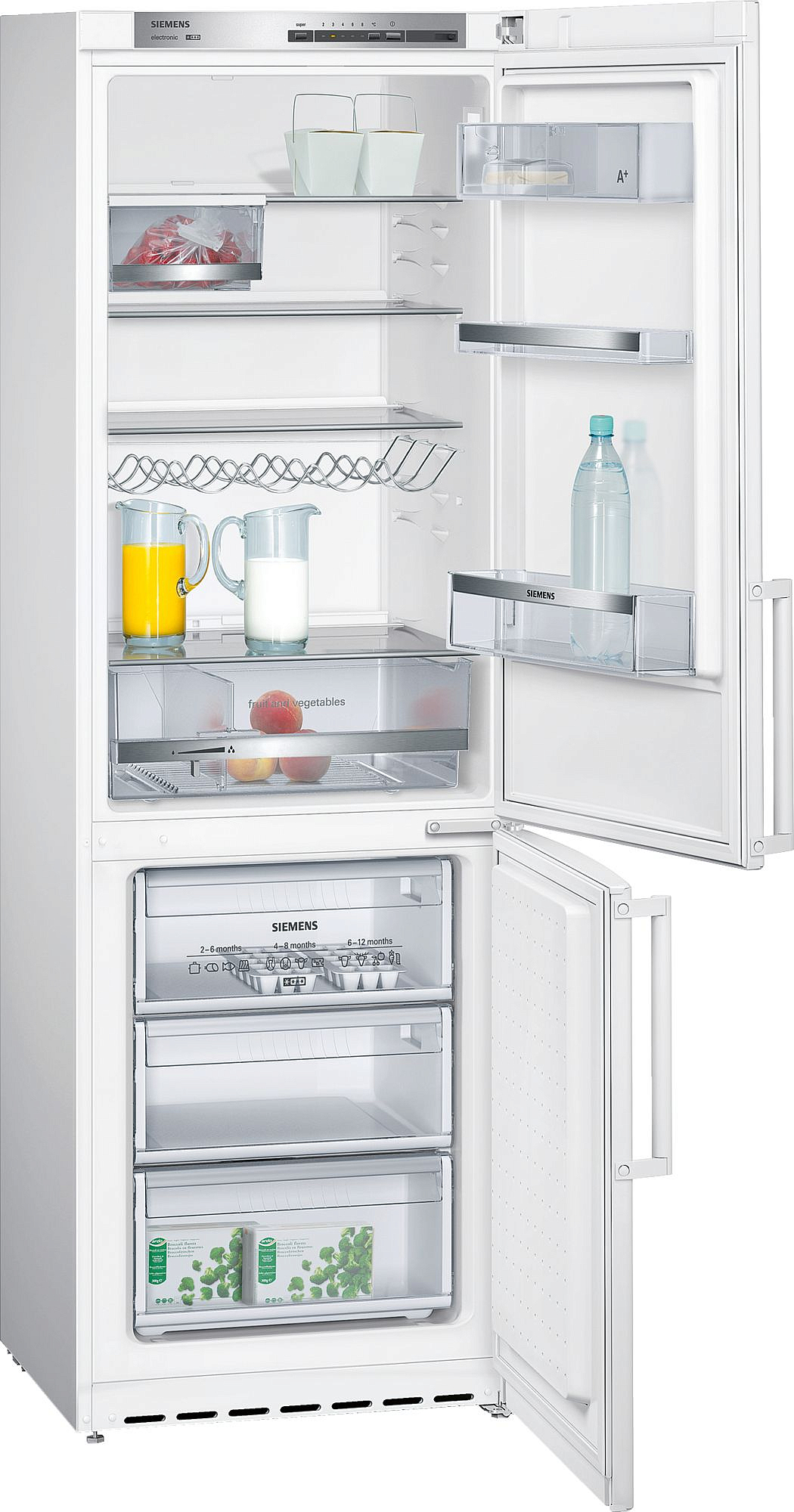 Компактный, двухкамерный холодильник Siemens KG 36VXW20 R белого цвета прекрасно подойдет к любой кухни. Он имеет холодильную камеру, которая состоит из четырех стеклянных полок и большой подвески для разных бутылок. Также имеется две подставки для яиц, один прозрачный и пластиковый выдвижной контейнер для хранения молочных продуктов и ящик из пластика для овощей и фруктов с разделителями. Морозильная камера с тремя выдвижными ящиками и удобным лотком для приготовления льда расположена внизу. Наличие электронного управления позволяет контролировать температуру в холодильнике и морозильной камере. Модель Siemens имеет систему капельного размораживания холодильной камеры, что помогает быстро разморозить холодильник при необходимости.
