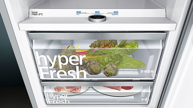 Зона HyperFreshpremium состоит из двух секций. Вы можете регулировать температуру в ящике для мяса с помощью сенсорного дисплея и устанавливать подходящую влажность в отсеке для овощей, пользуясь специальным переключателем.