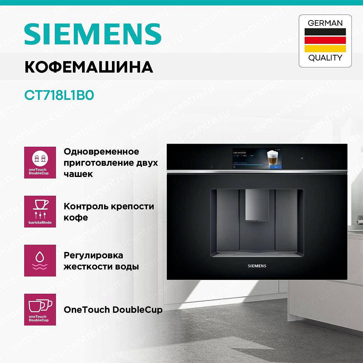 OneTouch DoubleCup — инновационная функция в кофемашинах Siemens, позволяющая приготовить две чашки кофе одновременно одним нажатием кнопки. Благодаря симметричной системе подачи напитка обе порции готовятся параллельно, сохраняя одинаковую температуру, крепость и качество. Эта технология экономит время утром или при приёме гостей, обеспечивая идеальный кофе без необходимости дважды запускать цикл заваривания. OneTouch DoubleCup доступен для различных рецептов — от эспрессо до лунго, — и легко настраивается под предпочтения пользователей.