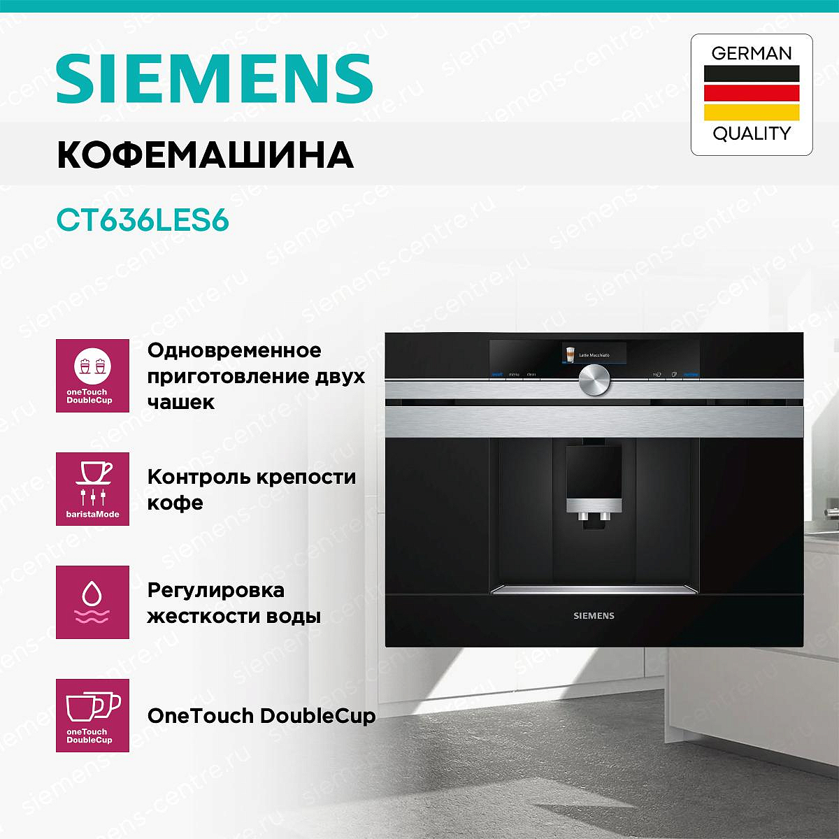 OneTouch DoubleCup — инновационная функция в кофемашинах Siemens, позволяющая приготовить две чашки кофе одновременно одним нажатием кнопки. Благодаря симметричной системе подачи напитка обе порции готовятся параллельно, сохраняя одинаковую температуру, крепость и качество. Эта технология экономит время утром или при приёме гостей, обеспечивая идеальный кофе без необходимости дважды запускать цикл заваривания. OneTouch DoubleCup доступен для различных рецептов — от эспрессо до лунго, — и легко настраивается под предпочтения пользователей.