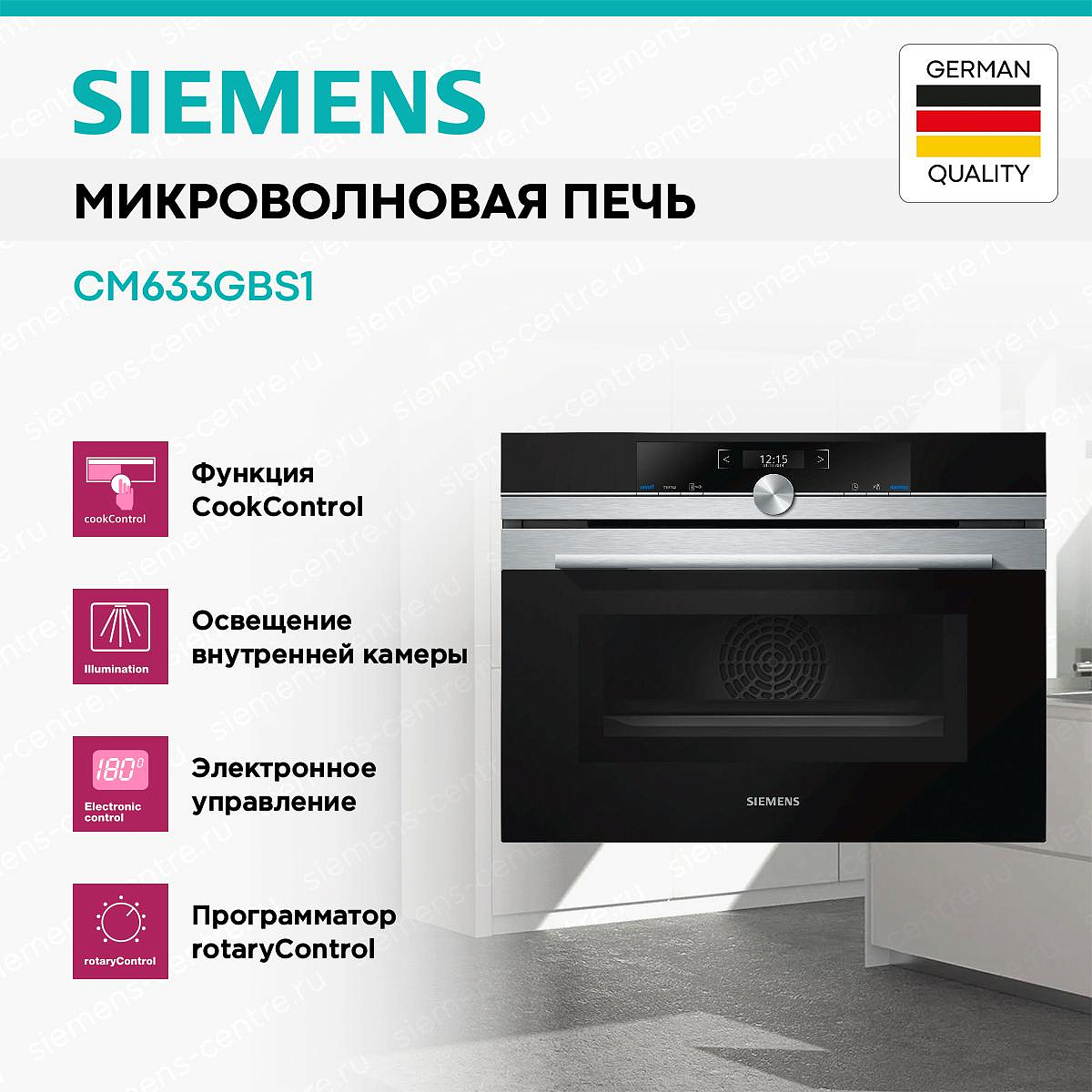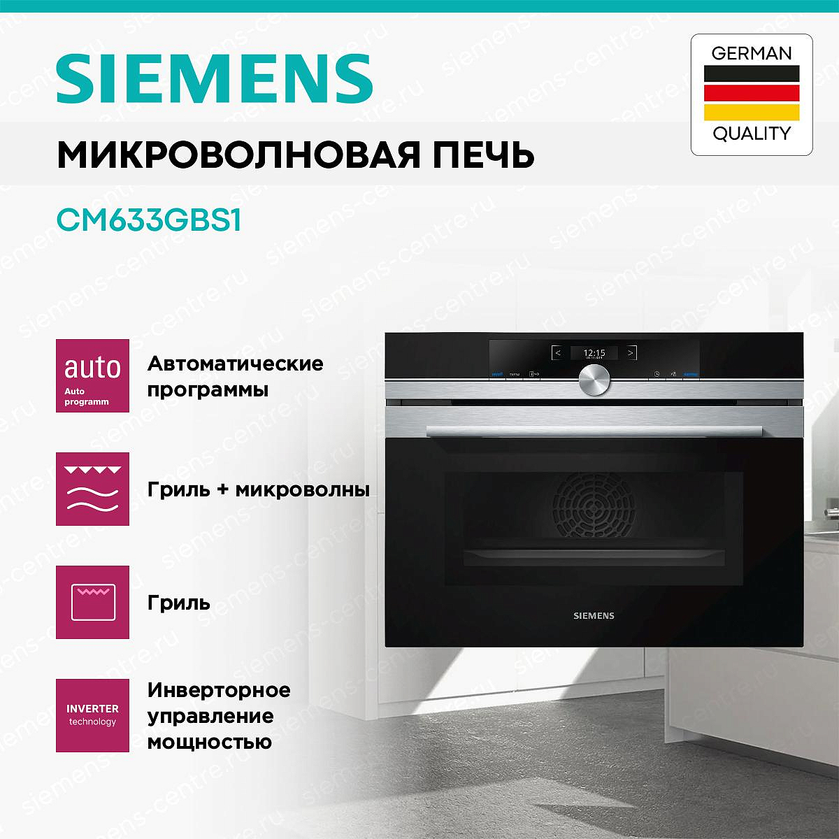 Микроволновая печь SIEMENS CM633GBS1 выполнена в стильном корпусе с элементами цвета «Нержавеющая сталь» и отлично впишется в любой современный кухонный интерьер