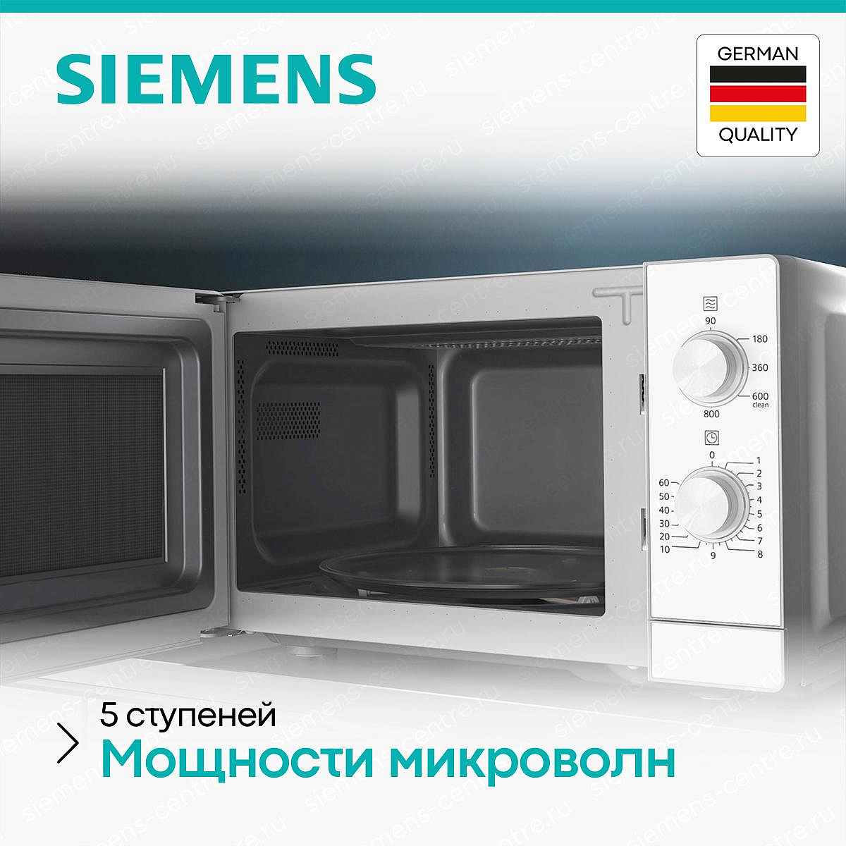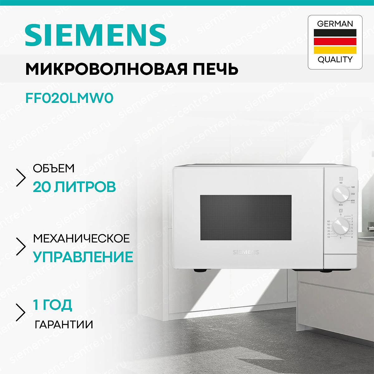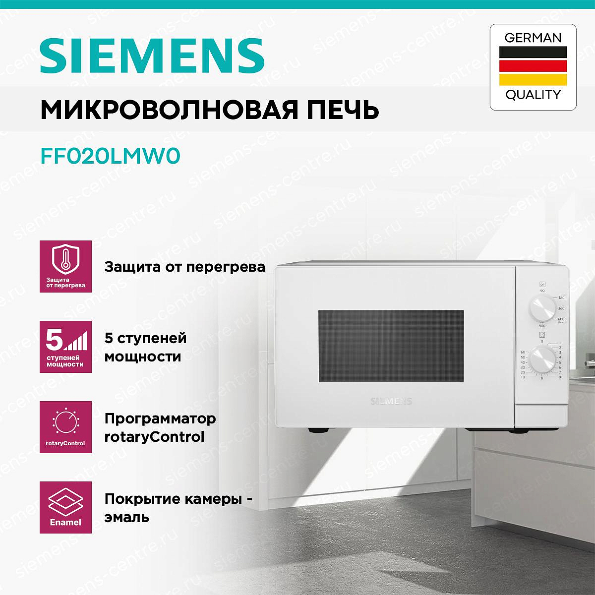 Микроволновая печь Siemens iQ300 FF020LMW0 белый — компактный прибор, идеальный для быстрого разогрева и подготовки простых блюд в условиях ограниченного пространства.