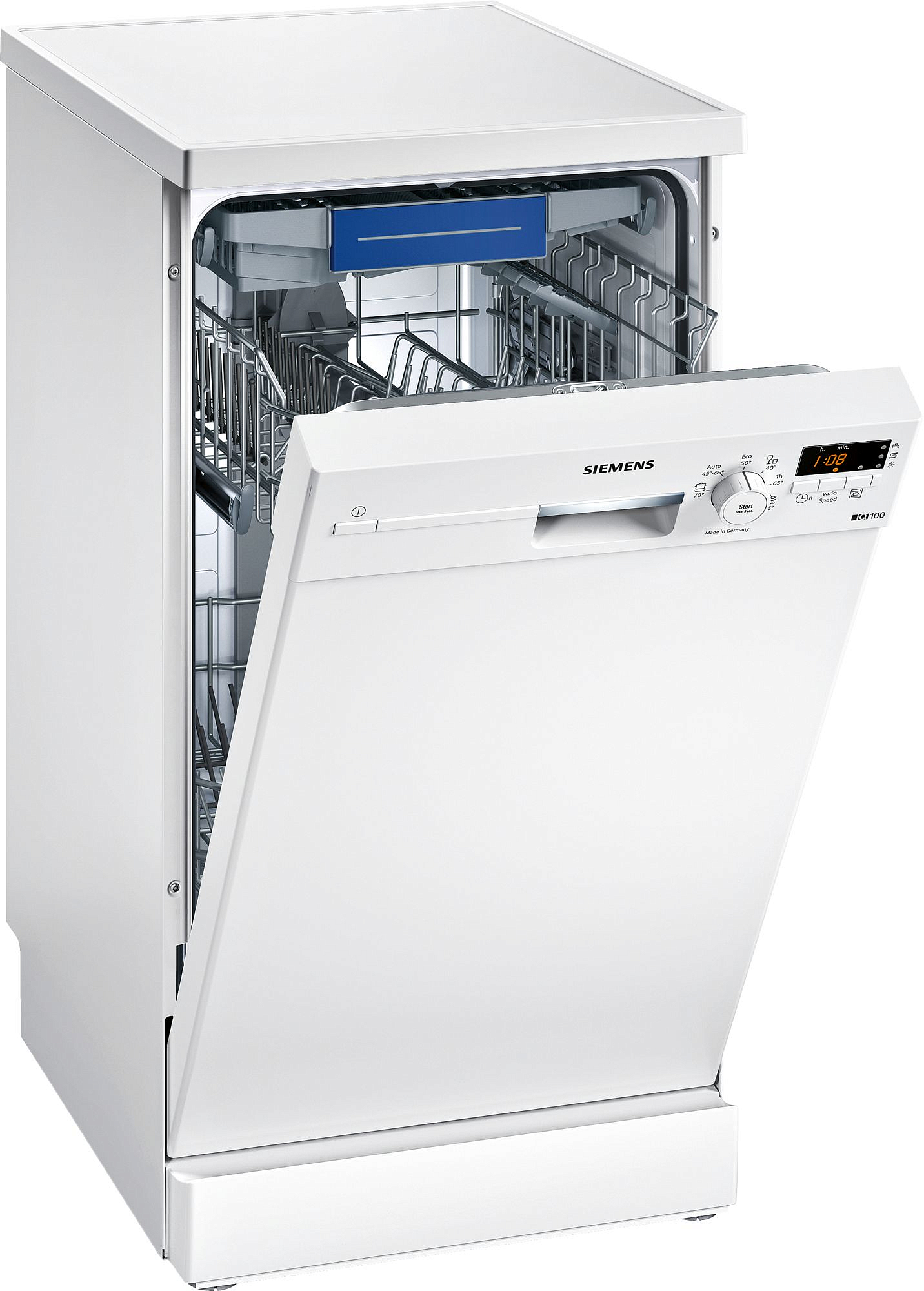 Siemens SR216W01MR — отдельностоящая посудомоечная машина с шириной не более 45 см. Такие размеры позволяют разместить прибор в небольшом помещении. Доводчик двери обеспечивает плавное и мягкое закрывание прибора. Опция 3 в 1 автоматически определяет тип моющего средства. Функция aquaStop предохраняет имущество и сам прибор от протечек.