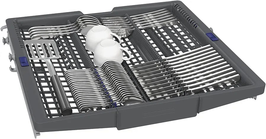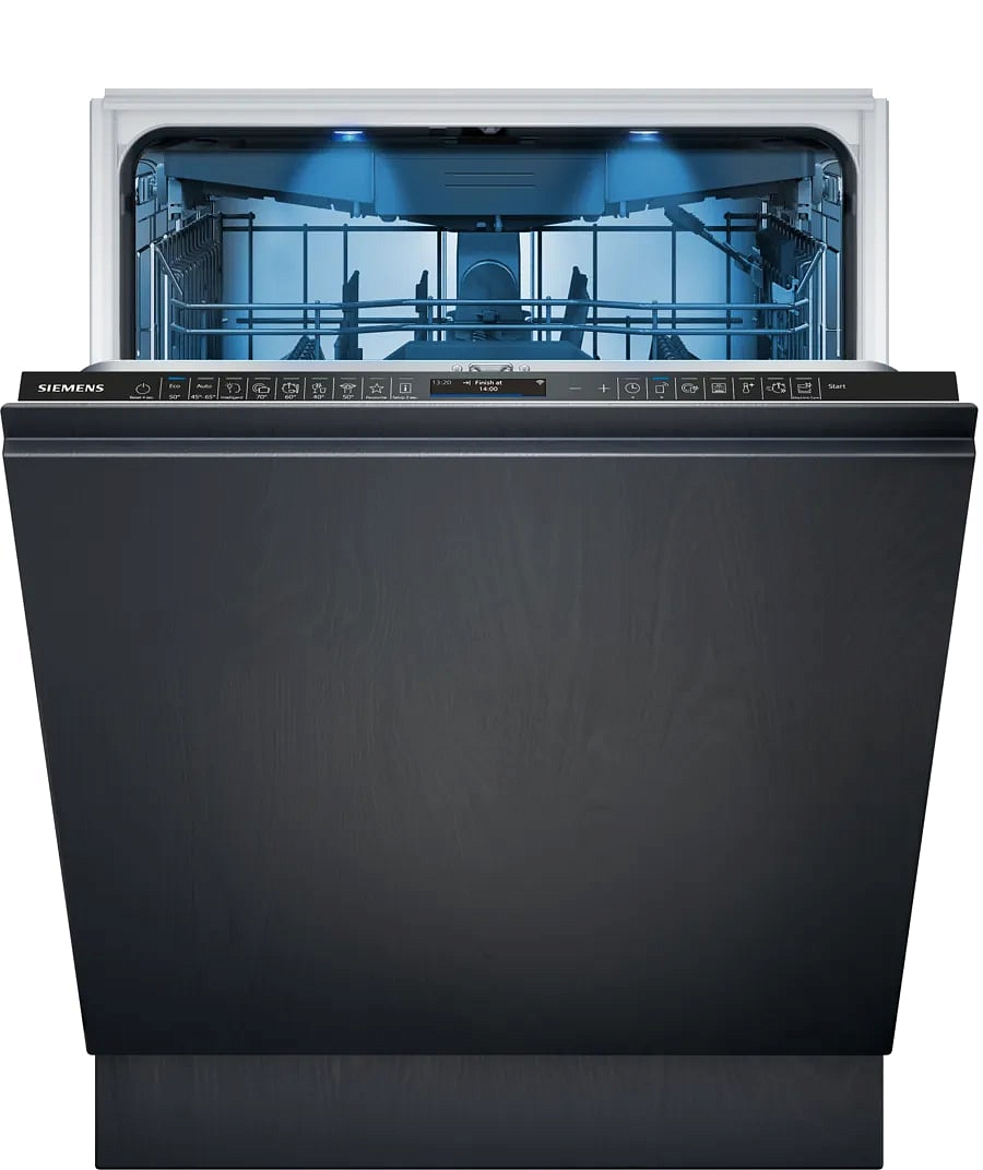 Встраиваемая посудомоечная машина Siemens SN87TX02CE серии iQ700 представляет собой премиально оформленный полноразмерный прибор для интеграции в мебель, рассчитанный на длительное использование с гарантией 12 мес. Внешний облик сочетает лаконичную фронтальную панель и продуманную функциональность: ширина корпуса 59.8 см при глубине 55 см обеспечивает компактную установку, а регулируемая высота от 81.5 до 87.5 см позволяет легко вписаться в нишу размером 81.5-87.5 х 60 х 55 см. Полновстраиваемая конструкция делает фасад незаметным в интерьере, при этом чёрная сенсорная панель с цветным TFT-дисплеем выглядит современно и удобна в эксплуатации.