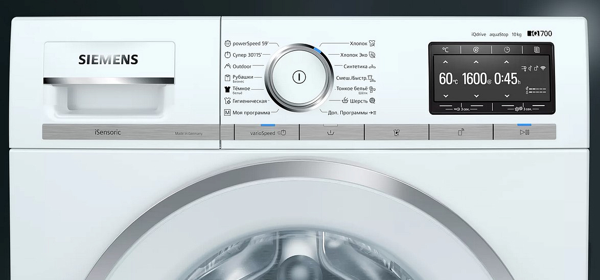 Стиральная машина Siemens WM16XFH1OE выполнена в универсальном белом цвете. Прибор оснащен TFT-дисплеем, на котором удобно наблюдать за ходом программы. Удобное управление позволяет быстро и точно устанавливать скорость отжима и температуру, а также активировать дополнительные опции, например — отложенный старт или функцию удаления пятен. Особая конструкция корпуса antiVibration уменьшает количество вибраций и снижает уровень шума.