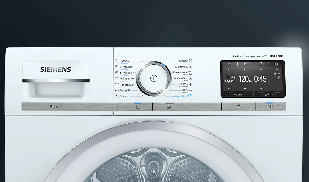 Для управления и отображения информации в устройство встроен сенсорный TFT-дисплей, который загорается при включении и позволяет программировать работу девайса легкими и скользящими движениями. При включении функции антисминания механизм не отключается, не прекращает работу по завершении сушки, а время от времени возобновляет движение барабана, чтобы вещи внутри не слеживались и, соответственно, не успели образоваться стойкие складки.