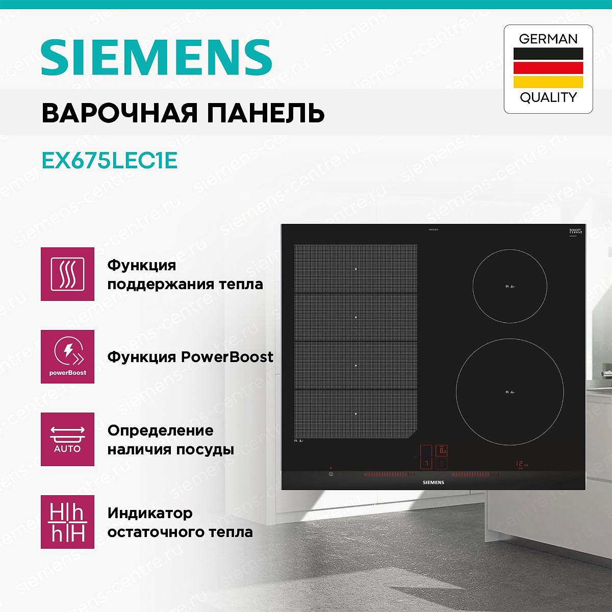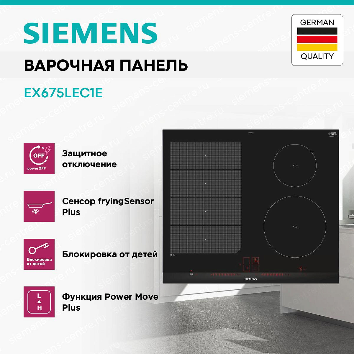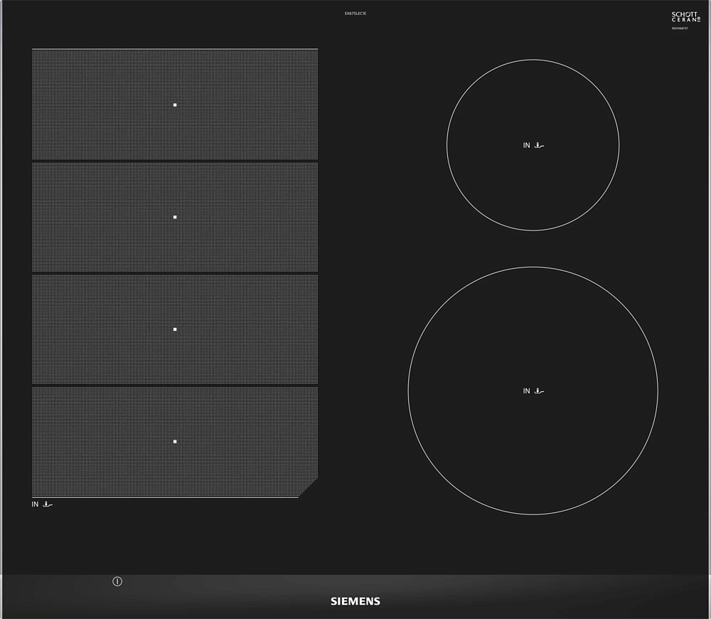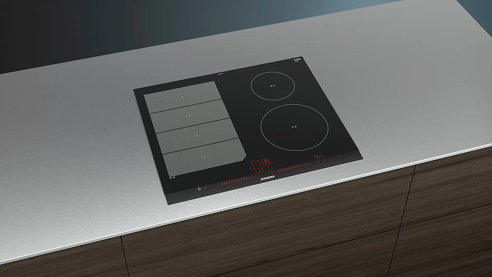 Индукционная варочная панель Siemens EX675LEC1E оснащена режимом PowerBoost она увеличивает мощность нагрева на 50%, вы можете в за считанные минуты вскипятить воду. FryingSensor Plus поддерживает температуру посуды после ее нагрева автоматически. При включении функции блокировка от детей панель управления заблокируется, это убережет от случайного нажатия.