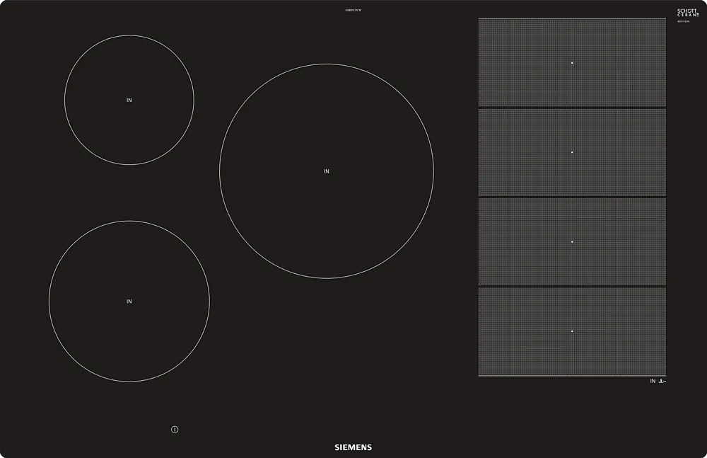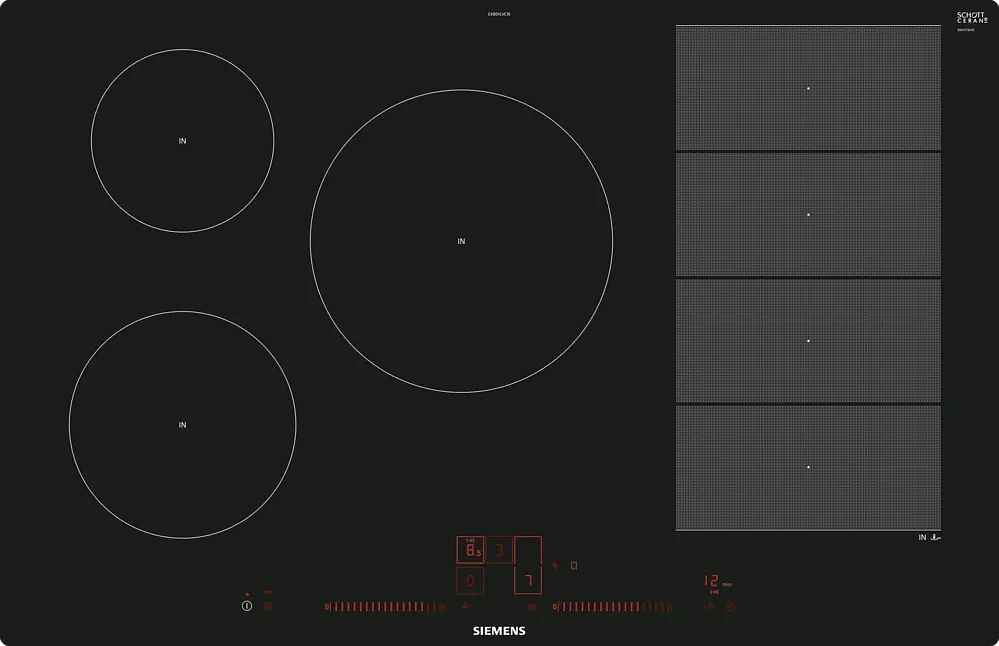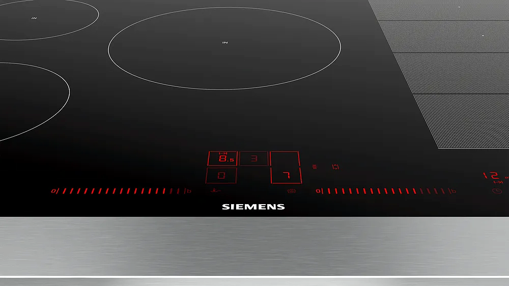 Индукционная варочная панель Siemens EX845LVC1E из серии iQ700 сочетает современную эстетику и продвинутые технологические решения, выполненная в лаконичном черном исполнении на стеклокерамической поверхности с аккуратной рамкой по периметру. Тонкая окантовка придает изделию завершенный вид при встраивании в столешницу минимальной толщины 1.6 см, а общий профиль высотой 5.5 см обеспечивает компактность и удобство монтажа. Специальный дизайн центральной зоны диаметром 24 см и двух гибких областей FlexInduction делает прибор универсальным для крупных жарочных сковород и компактной посуды: правая и центральная зоны достигают мощности до 3.7 кВт в режиме Boost, в то время как ближние и дальние секции предлагают диапазон от 1.4 до 3.7 кВт, обеспечивая стабильный прогрев разного объема емкостей.