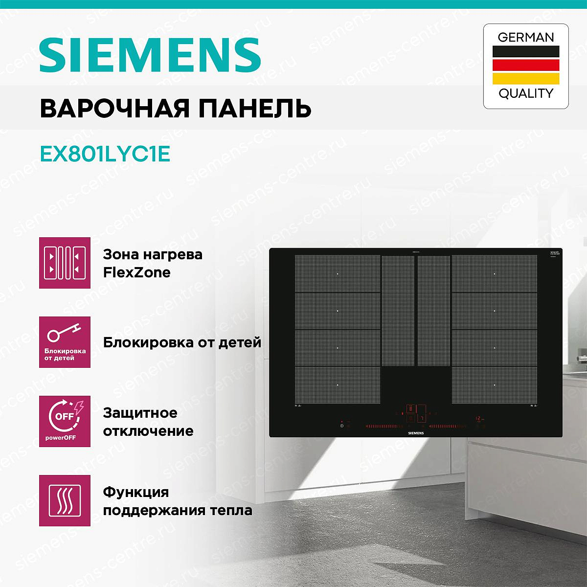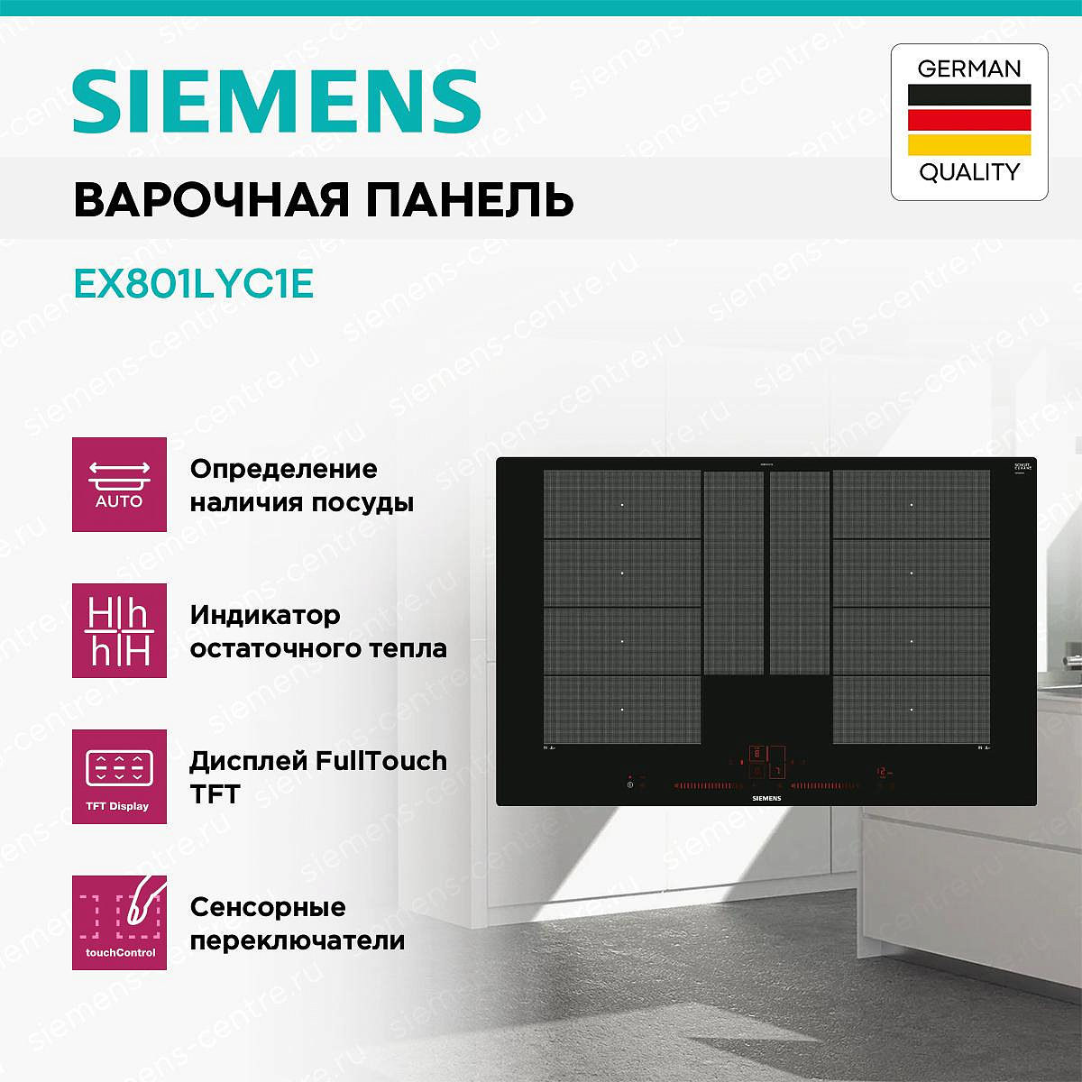 Индукционная варочная панель Siemens EX801LYC1E — модель из линейки iQ700 для монтажа вровень со столешницей. При перемещении кастрюль и сковородок настройки сохраняются благодаря технологии varioMotion. Функция PowerBoost кратковременно увеличивает мощность нагрева, чтобы быстро вскипятить большой объем воды.
