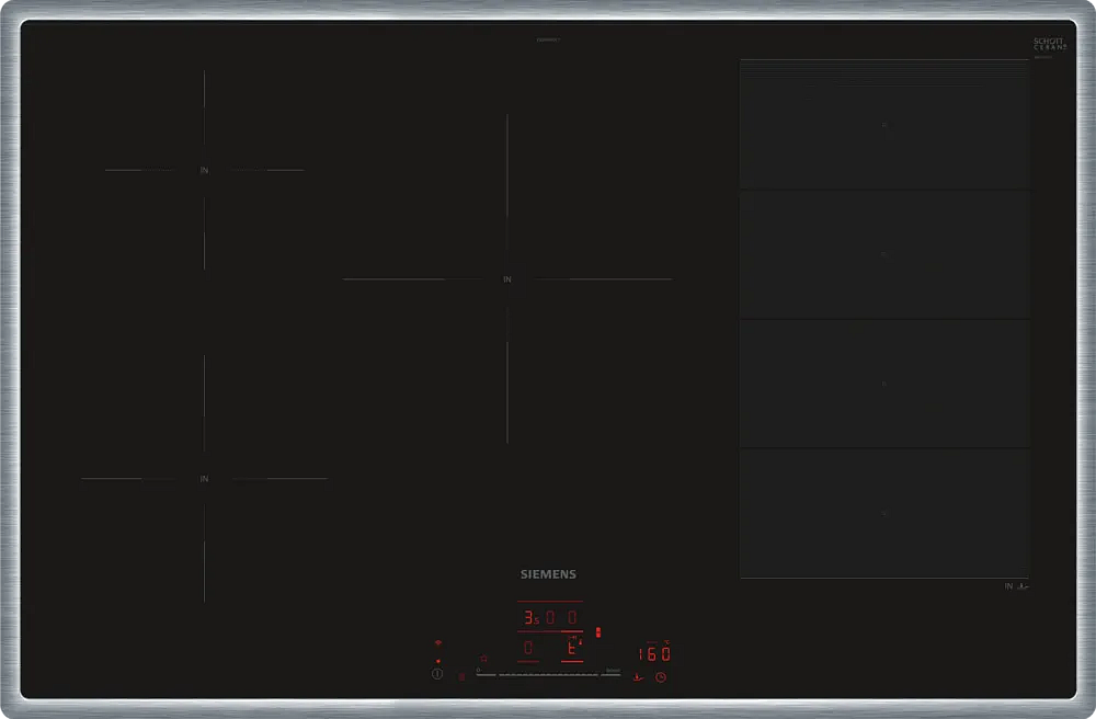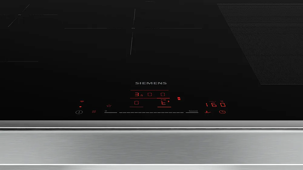 Siemens EX845HVC1E из серии iQ700 представляет собой сочетание минималистичного дизайна и профессиональных технологий для домашней кухни. Черная стеклокерамическая поверхность с аккуратной рамкой по периметру выглядит элегантно и ненавязчиво, легко интегрируется в интерьеры разных стилей. Стекло устойчиво к высокотемпературным нагрузкам и практично в уборке, а ровная плоскость обеспечивает комфорт при готовке и эстетичный внешний вид без лишних деталей. Рамочный контур подчеркивает границы модуля и защищает торцы, сохраняя аккуратный профиль после встраивания.