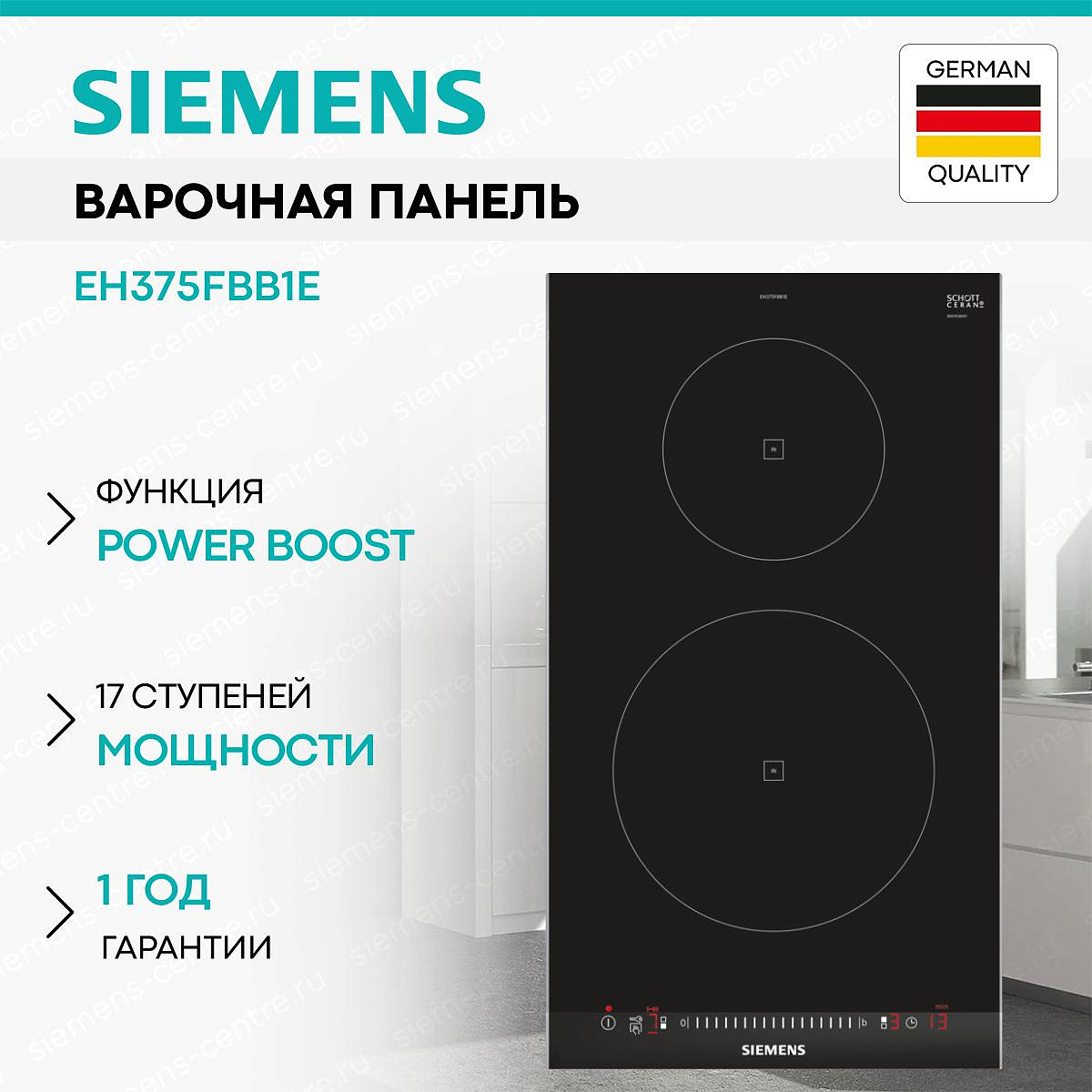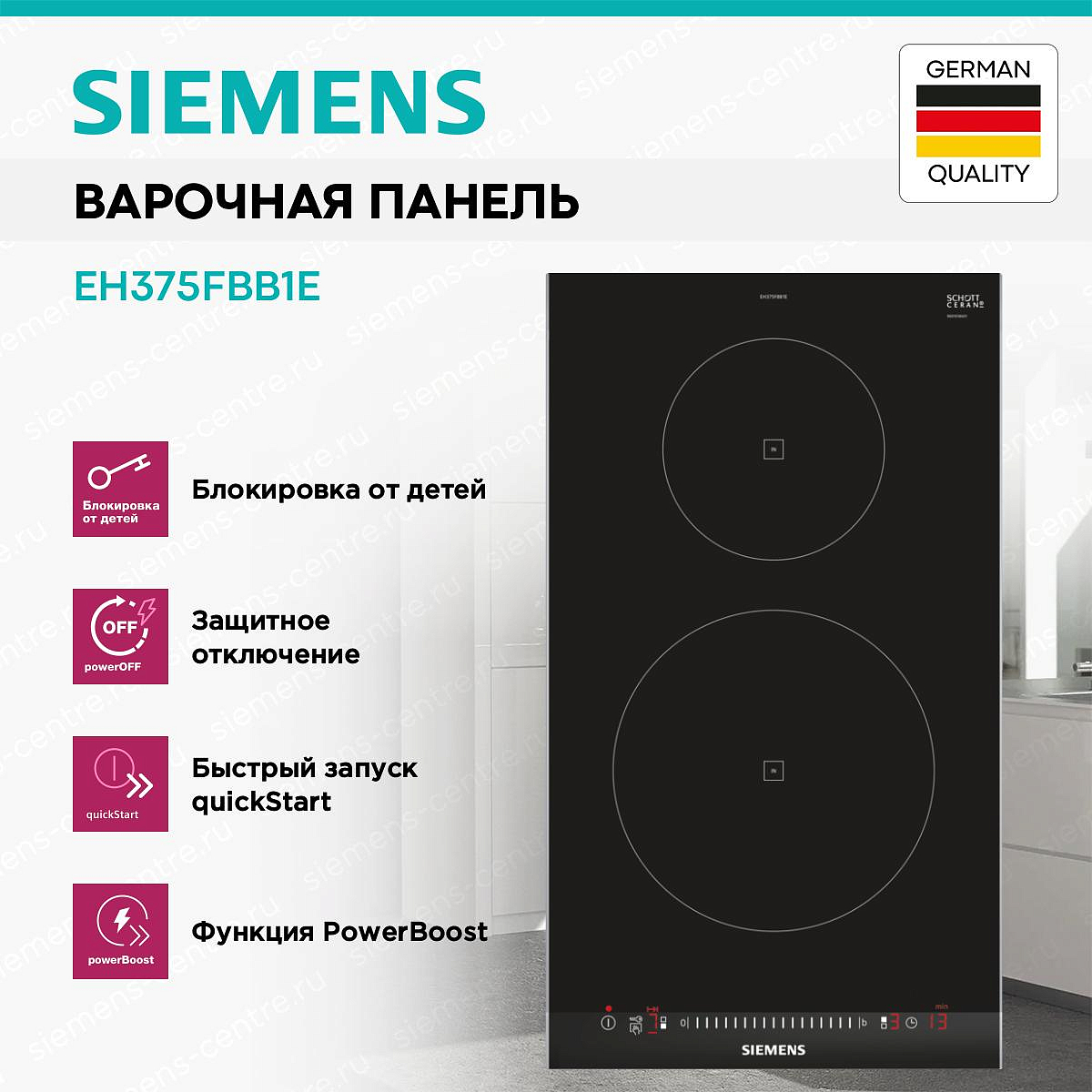 Варочная панель Siemens EH375FBB1E представлена в дизайне «Домино» и гармонично сочетается с другой бытовой техникой. С помощью сенсорного слайдера touchSlider можно легко и точно установить параметры работы данной модели. Таймер отсчитывает время с начала приготовления, что позволят не забыть помешать блюдо, а также добавить ингредиенты или специи. Функция re-Start сохраняет настройки в течение 4 секунд, если пользователь нечаянно выключил прибор, или в течение 60 секунд, если варочная панель отключилась вследствие пролива жидкости на панель управления, что обеспечивает комфорт и безопасность эксплуатации.