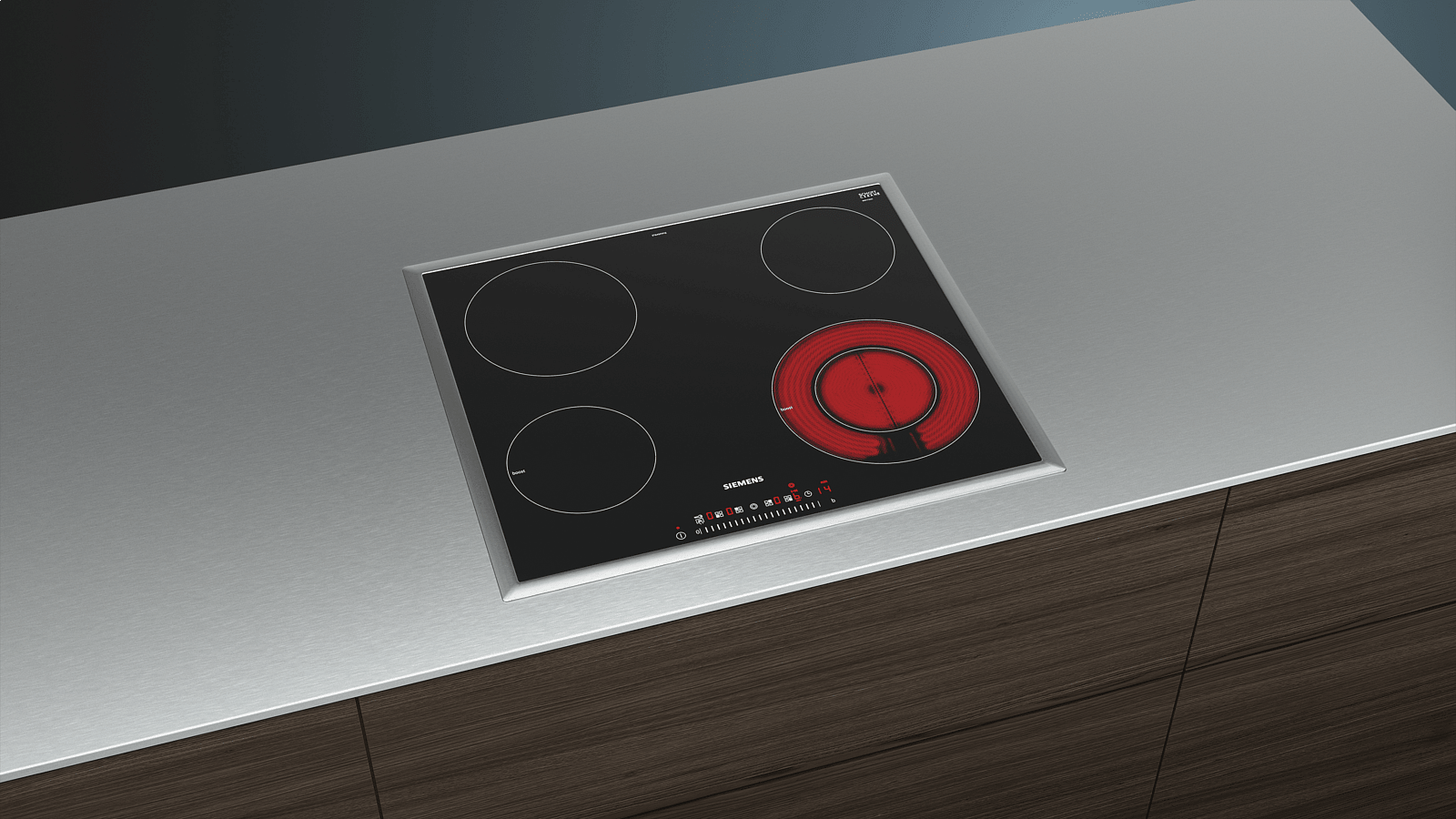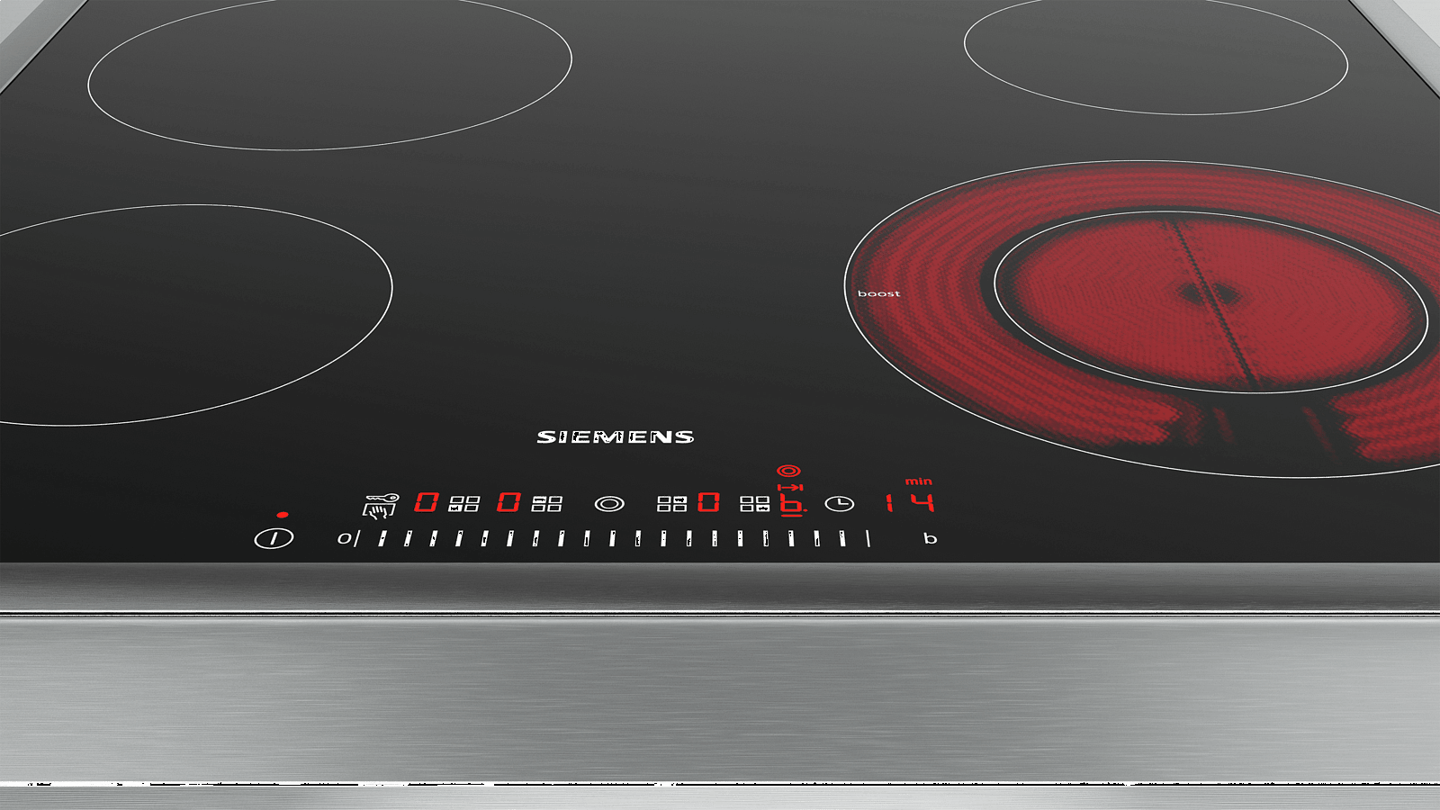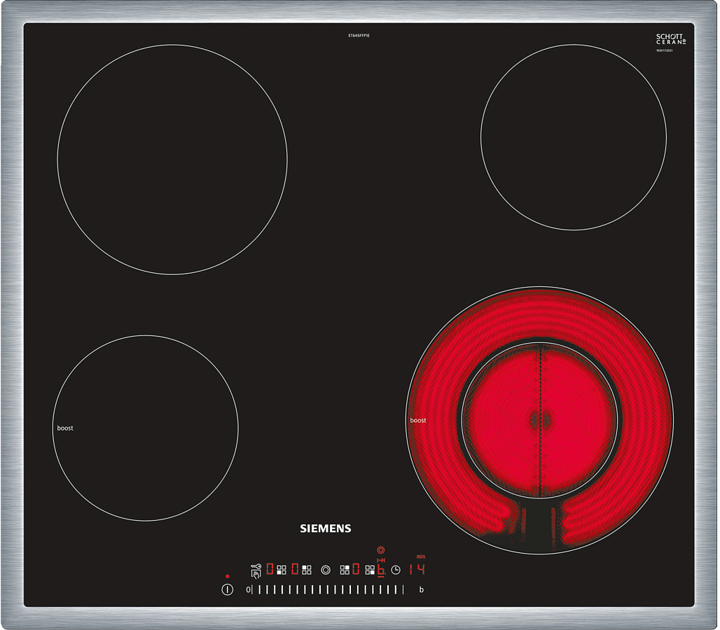 Электрическая варочная панель Siemens ET645FFP1E выполнена в черном цвете и дополнена рамкой из стали по периметру. Во время работы нагреваются только включенные конфорки, остальная часть стеклокерамической поверхности остается холодной, что минимизирует возможность случайных ожогов. Четыре варочные зоны быстрого нагрева имеют различный диаметр, что повышает удобство пользователя. Одна из конфорок двухконтурная и обеспечивает максимально быстрый нагрев посуды большого размера. Для простоты работы поверхность оснащена сенсорными переключателями touchSlider, цифровым дисплеем с индикацией уровня мощности для каждой конфорки, таймером с возможностью автоматического отключения. Для безопасности в панели предусмотрены индикаторы остаточного тепла, защитное отключение и блокировка от детей.