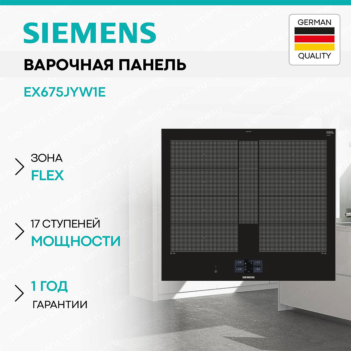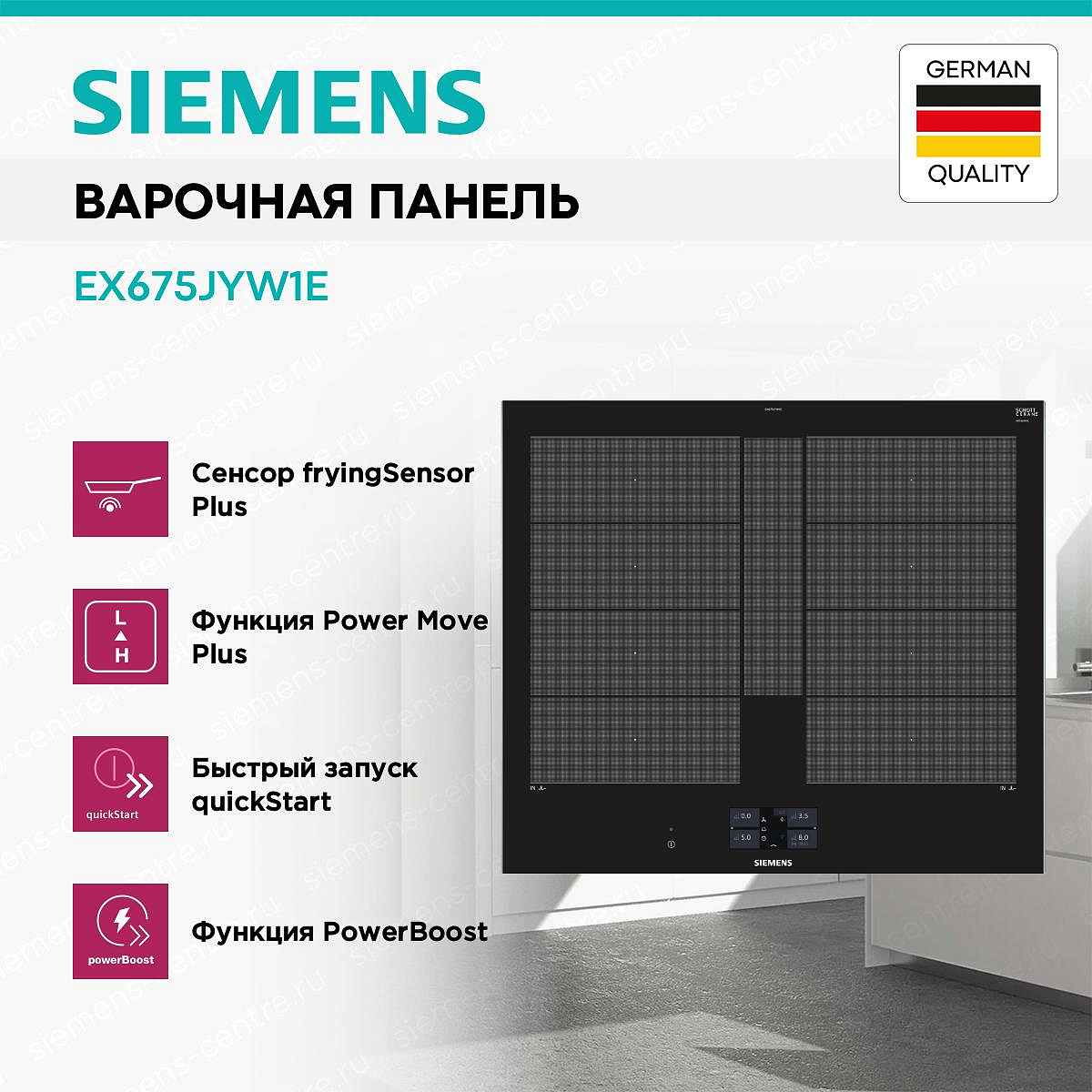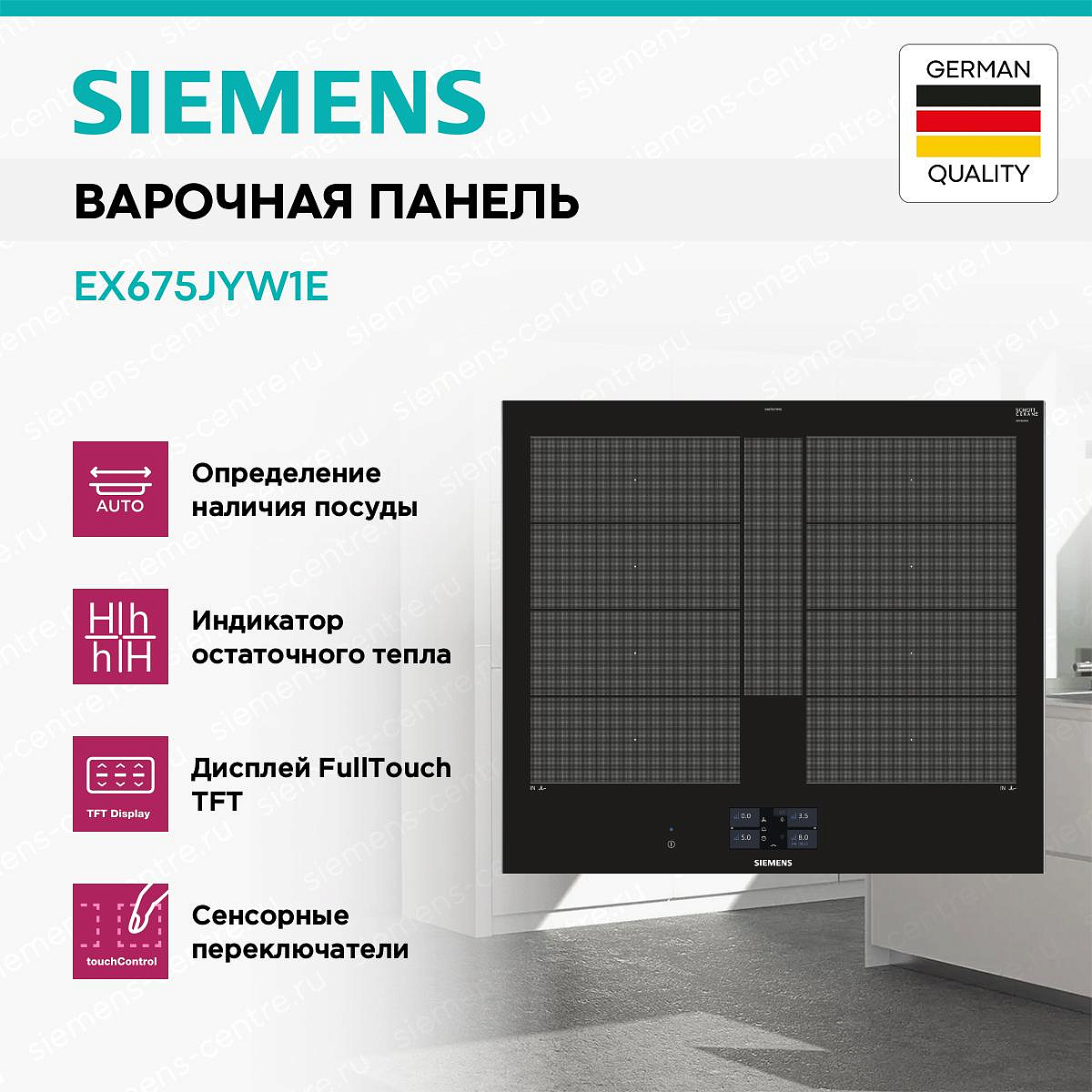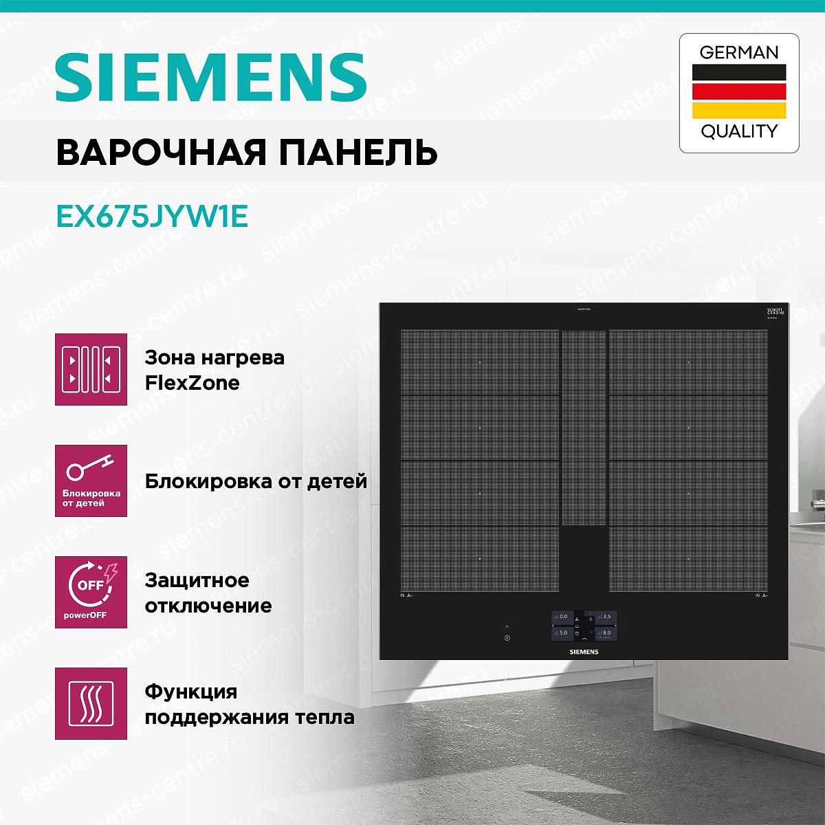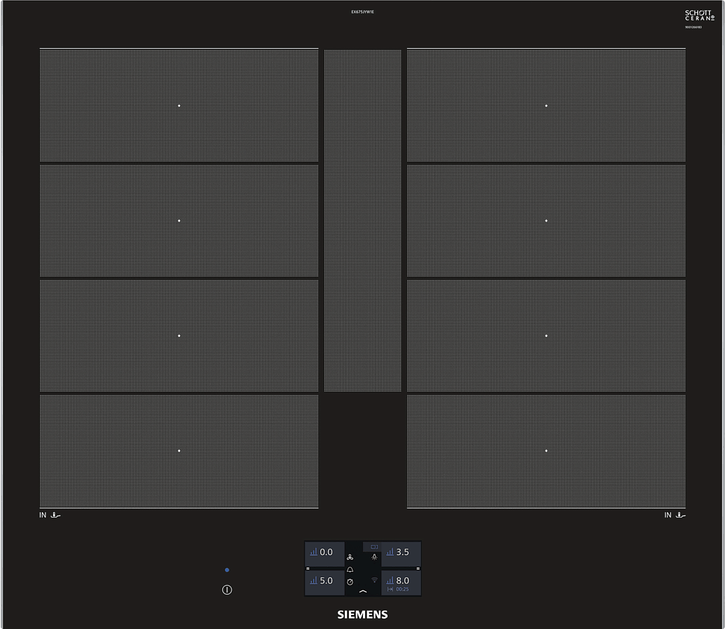 Индукционная варочная панель SIEMENS EX675JYW1E представлена в черном цвете из стеклокерамики — она устойчива к высоким температурам. Такой дизайн варочного устройства идеально впишется в любой кухонный интерьер